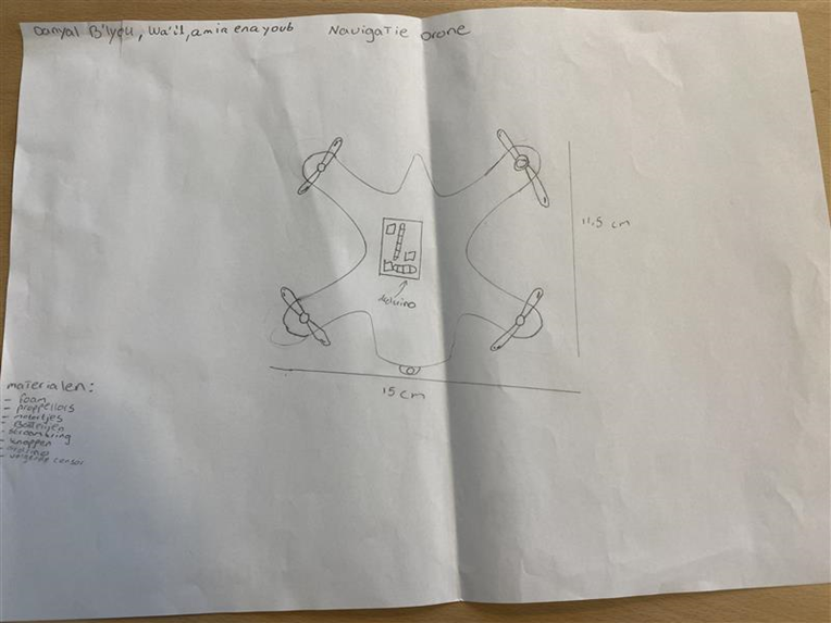 dit is onze schets van ons protoype. hierbij bedachten we onze ideeen en gingen we brainstormen wat het best past bij onze drone die hulpdiensten kan helpen. zoals je kan zien hebben we bedacht om een drone te maken met een camera, GPS, verkeersherkenning, AI software voor routeplanning, navigatie en communicatie met verkeerslichten. zodat de drone de hulpdiensten de snelste en veiligste route kan laten zien.